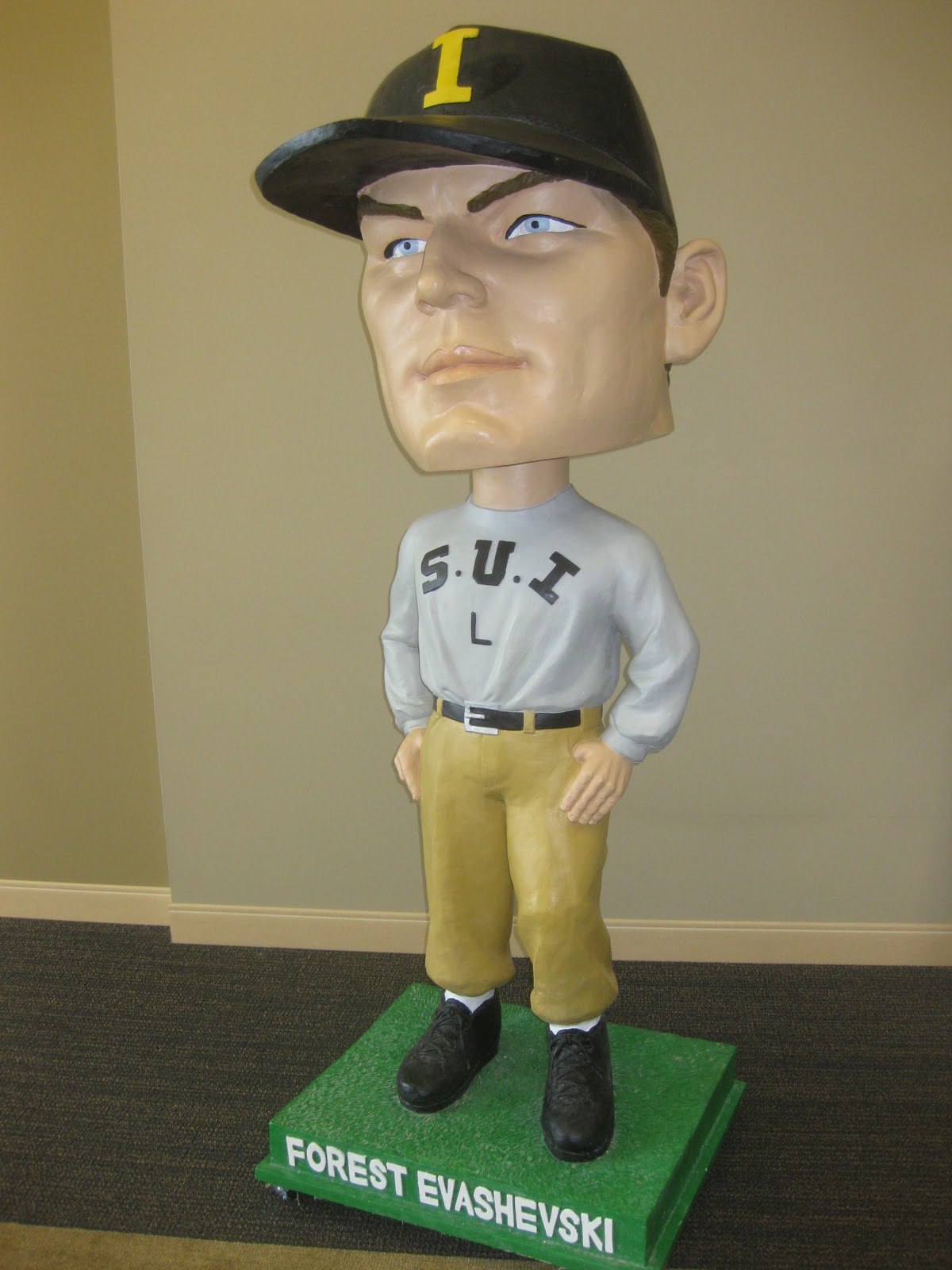 Greeting members of the media as the exited the press box elevator was the lifesize bobblehead of former Hawkeye coach, Forest Evashevski.